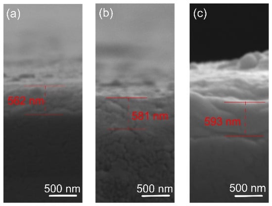 The film thickness was determined by SEM analysis of cross-sections. The results are shown in Figure 2. The coating thickness was found to be about 560, 580, and 590 nm for the films deposited at 400, 450, and 500 degrees, respectively. It is known that the substrate’s temperature barely affects the film’s growth rate [38], as confirmed in this study. The morphology of the film indicates a smooth fractured surface, which is characteristic of the growth of films with small adatom mobility. Similar featureless morphology was reported by [39] when the oxygen flow was increased and film densification occurred. The small thicknesses of the oxide films suggest low deposition rates of Ta. In actuality, when compounds form on the targets, metal sputter rates drastically decrease [40]. The pressure of the reactive gas has a significant impact on this effect. Since a stable stoichiometric ratio of the thin layers must be maintained, increased argon concentration is not preferred over deposition rate, since it was reported that varying oxygen flow levels can trigger a phase shift [39].