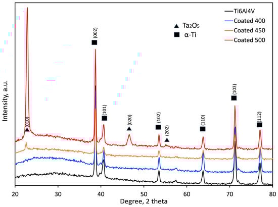 The crystallographic structure of the samples was examined by XRD analysis, and the obtained XRD patterns of the coated and control (Ti6Al4V alloy) groups are displayed in Figure 3. Both groups’ diffraction peaks were comparable to metallic α-Ti (International Centre for Diffraction Data (ICDD) card no. 00-001-1198). Cu-Kα radiation’s penetration depth (~10 μm), which is greater than the film thickness (≈550–600 nm), explains this behaviour. In addition to α-Ti peaks from the substrate, the XRD pattern of the coated sample indicates the presence of orthorhombic β-Ta2O5 according to the relevant Joint Committee on Powder Diffraction Standards (JCPDS) card (ICDD card no. 01-079-1375). The broad diffraction maxima (hump) in the 2θ range 20–35° suggests an amorphous structure (a-Ta2O5) of the coating deposited at 400 °C [23,41,42]. An inadequate energy flux that destabilised the interfacial interaction between tantalum oxide and the substrate material may cause this amorphous layer formation. An amorphous, non-crystalline film was produced when tiny charged clusters nucleated in the gas phase and failed to adjust to the substrate’s surface structure [43].
