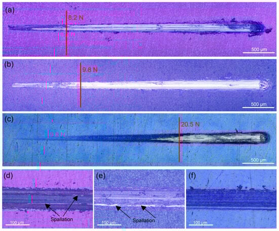 Scratch track images of the tantalum oxide films deposited at: (a) 400, (b) 450, and (c) 500 °C on Ti6Al4V alloy. Representative micrographs of failure after applying a constant load of 8 N on the tantalum oxide films deposited at: (d) 400, (e) 450, and (f) 500 °C.