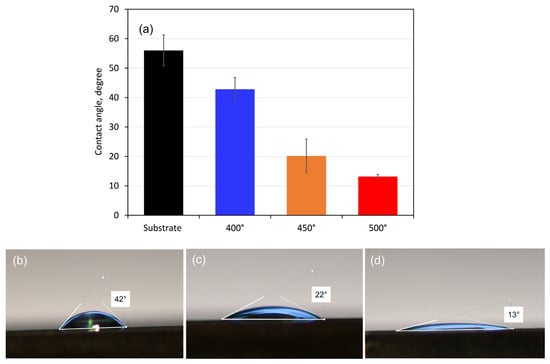 Mean contact angle values (a) with droplets of 5 µL SBF and side views of drops on the surface of (b) 400, (c) 450, and (d) 500 °C-coated samples. The bars indicate the standard deviation values.