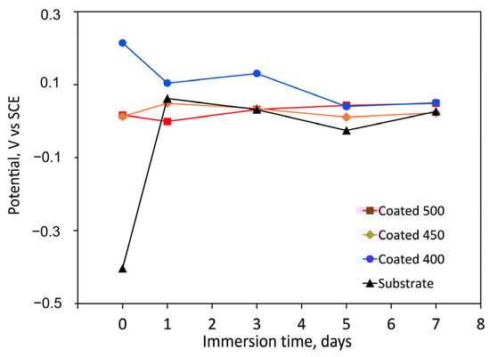 The longevity of a prosthesis may be limited by surface degradation due to tissue responses to corrosive substances. Coatings’ resistance to corrosion can be influenced by several factors, including their thickness, porosity, wettability, composition, particle size, microstructure, etc. Figure 6 displays the change in OCP for both the bare substrate and the substrate coated with tantalum oxide films as a function of immersion time. Compared to the control, the amorphous coating displayed the highest positive OCP values. More positive OCP values are known to be linked to superior corrosion behaviour. Because of their less hydrophilic surfaces, the amorphous film had lower negative OCP values (reduced activity) than the more hydrophilic crystalline films (Figure 5). Due to their more negative OCP values, the crystalline coatings’ initial electrochemical activity ought to be higher. These findings might suggest that the a-Ta2O5 surface treatment improves the electrochemical resistance.