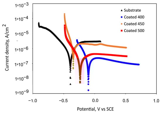 Figure 7 indicates the passive behaviour of all coated samples and bare alloy. For the substrate, an active–passive transition is seen following an initial range of cathodic de-passivation (Figure 7), with passivating currents of a few microamperes, which are commonly seen when passivating titanium and its alloys [51]. The polarisation curves reveal that the specimens coated at 450 °C and uncoated specimens’ onset of passivity occurs in the same potential region, suggesting that the formation of the passive oxide film appears to take place under comparable potential requirements and a similar mechanism. The small peak presence in the passive region of the 450 °C-deposited coating suggests a localised attack occurrence for this specimen in the SBF solution. The nanocrystalline film demonstrated lower Rp and higher jcorr values than the bare titanium alloy, which caused a lack of corrosion prevention effectiveness (Table 3). This electrochemical performance can be explained by the increased number of grain boundaries and other crystallographic imperfections, such as dislocations, vacancies, nanopores, stacking faults, etc.