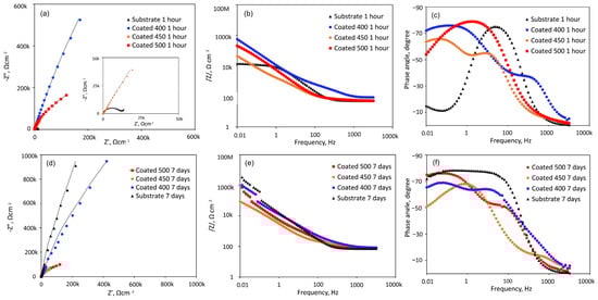 EIS analysis of the coated and uncoated samples immersed in SBF solution at 37 °C for 1 h and 7 days: (a,d) Nyquist diagrams; (b,e) Bode plots; (c,f) phase angle curves.