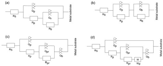 The substrate circuit was inferred to depict the electrochemical activity of a metal owning an unsealed porous layer covering it. When titanium was submerged in the medium for a shorter and longer period, the oxide layer changed into a Ti–TiO2 inner-TiO2 outer porous sealed layer [54]. In this scenario, in the equivalent circuit, as depicted in Figure 9a, there is the charge transfer resistance (Rp) related to the electrolyte’s penetration via the coating’s pores or pinholes, and the inner barrier layer resistance (Rb) together with the corresponding capacitance, Qp and Qb, of the porous and intact (non-defective) layer. A frequency-dependent constant phase element (CPE or Q) with exponent “n” is used to replace an ideal capacitor to achieve a better match due to the electrode surface’s discontinuities and heterogeneities [55]. A deviation from the ideal capacitor/resistor is indicated by the exponent n, where n = 0 for a pure resistor and n = 1 for a pure capacitor.