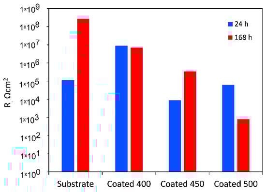 The low Rp values after 1 h of immersion of the highly crystalline coating indicate that ions can travel more easily within its outer porous layer, perhaps due to increased porosities and higher surface wettability. Despite the higher deposition temperature, pinholes and voids, such as those detected in Figure 1c, are still present and could cause the coating’s decreased resistance to corrosion. These flaws contribute significantly to the start and spread of corrosion, which damages coatings in corrosive conditions [58]. After 7 days, the resistance of the porous layer increases while that of the small micropores in the compact part of the layer decreases, indicating that the precipitates cannot effectively block the diffusion. The aggressive Cl− ions can easily penetrate these flaws, increasing the damage caused by electrochemical corrosion. In other words, metal dissolution proceeds through the coating because the salts deposited in the pores do not effectively impede it or are insufficient in quantity. As a result, the W value rises with time while the Qpr value falls. The low coating thickness usually causes the rapid formation of localised galvanic cells and galvanic corrosion occurs. As a result, corrosion happens at two interfaces: the electrolyte substrate and the coating. The decline of Rp and Rb after 7 days of immersion is confirmed by the decrease in polarisation resistance (Figure 10), indicating that longer exposure times significantly worsen surface film disintegration.
