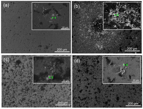 Representative SEM images of the bare and coated sample surfaces after 7 days of immersion in SFB solution (at 37 °C): (a) bare substrate; (b) 400 °C; (c) 450 °C; and (d) 500 °C-coated samples. The green marks indicate the EDS zones of interest.