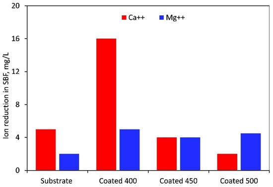 Magnesium and calcium ion reduction in SBF solution after 7 days of immersion of the uncoated and coated samples.