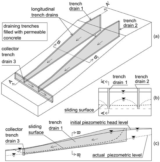 - Stanic, B. Influence of draining trenches on slope stability. J. Geotech. Eng. 1984, 110, 1624–1636. [Google Scholar] [CrossRef]