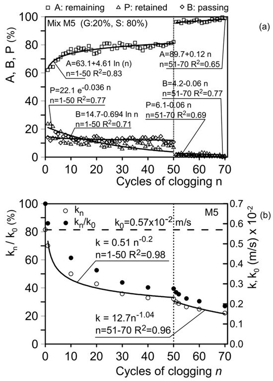 6.2. Study of the Trend of Remaining, Passing, and Retained Material, and a Model of Hydraulic Conductivity with Clogging Cycles