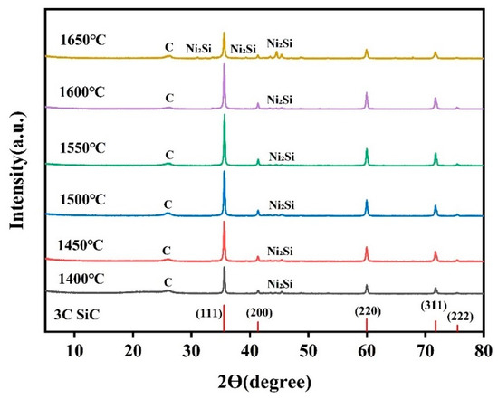 In order to explore the optimal growth temperature of SiCnws, the prepared SiC precursor powders were sintered at 1400 °C, 1450 °C, 1500 °C, 1550 °C, 1600 °C, and 1650 °C, respectively, and their phase composition was analyzed. The phase composition and crystal structure materials can be characterized by XRD analysis [41,42,43]. Figure 2 is the XRD pattern of the precursor powder at different temperatures. The XRD pattern shows that the sample mainly contains SiC. With the increase in sintering temperature, the characteristic peak of SiC increases first and then decreases, and the characteristic peak of carbon gradually decreases. The characteristic peaks of SiC appear at 35.73°, 41.49°, 60.13°, 71.95°, and 75.69°, corresponding to the (111), (200), (220), (311), and (222) crystal plane of SiC (NO. 73-1665). According to PDF card NO. 73-1665, the type of SiCnws is 3C-SiC, which belongs to the cubic crystal system. Cubic SiCnws have better microwave absorption performance [27]. At 1600 °C, the characteristic peaks of carbon almost disappear, showing the excellent crystallinity and purity of silicon carbide. There is also a Ni2Si peak in the XRD pattern. As nickel atoms reduce the reaction activation energy to promote the reaction of carbon source and silicon source, nickel atoms can also interact with silicon atoms to form Ni2Si, which is due to a certain chemical affinity between nickel and silicon atoms [44].