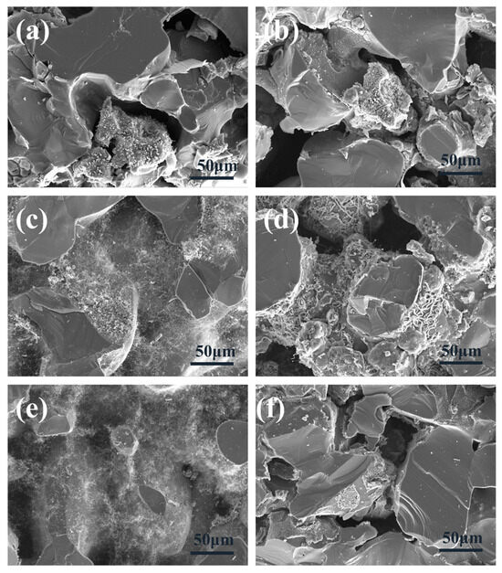 Micromorphology of the inner surface of SiCnws@SiC composites at different temperatures: (a) 1400 °C, (b) 1450 °C, (c) 1500 °C, (d) 1550 °C, (e) 1600 °C, and (f) 1650 °C.