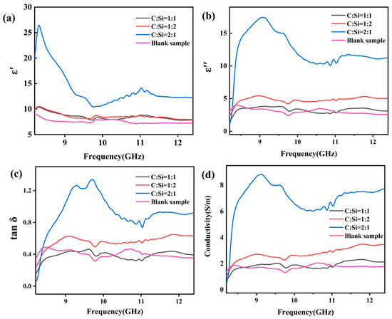 The conductivity in the material can affect the conduction loss, which also has a certain effect on the dielectric loss. The greater the conductivity of the material, the greater the conduction loss [57]. The conductivity of the sample with a C:Si ratio of 2:1 is the largest, indicating that the conductivity loss of the sample is better, but the high conductivity can lead to the impedance mismatch of the material [35].