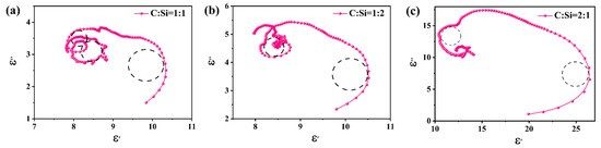 When the relationship between and can be described as a semicircle, it can be considered a Cole–Cole semicircle. Each Cole–Cole semicircle can represent a relaxation mechanism. The Cole–Cole diagram of the composite material is shown in Figure 11. Three semicircles can be observed in the sample with a C:Si ratio of 1:1, representing three relaxation mechanisms, and two semicircles in the samples with a C:Si ratio of 1:2 and C:Si ratio of 2:1. Compared with other samples, the sample with a C:Si ratio of 1:1 showed more semicircles, indicating that the polarization relaxation process is enhanced. When SiCnws are added, a large number of defects and nanoheterogeneous interfaces can be formed. Defects can act as the center of dipole polarization, and nanoheterogeneous interfaces have interfacial polarization [12], such as SiCnws/SiC nanoheterogeneous interfaces. The 3D network structure formed by SiCnws and composites can produce cross-polarization, which also further contributes to the Debye relaxation process [26].
