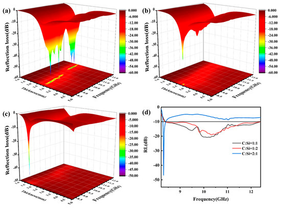 Figure 13 shows the change in the reflection loss of SiCnws@SiC composites with frequency under different thicknesses. The minimum RL (RLmin) of the sample with a C:Si ratio of 1:1 is −56.95 dB when the thickness is 2.30 mm, and the EAB covers 1.85 GHz. The RLmin of the sample with a C:Si ratio of 1:2 is −38.61 dB when the thickness is 2.83 mm, and the EAB covers 2.52 GHz. The RLmin of the sample with a C:Si ratio of 2:1 is −46.84 dB when the thickness is 1.77 mm, and the EAB is only 0.11 GHz. The optimal EAB of SiCnws@SiC composites in the test frequency band is as follows: The optimal EAB of the sample with a C:Si ratio of 1:1 is 4.01 GHz when the thickness is 2.59 mm. The optimal EAB of the sample with a C:Si ratio of 1:2 when the thickness is 2.50 mm is 4.03 GHz. The optimal EAB of the sample with a C:Si ratio of 2:1 when the thickness is 1.77 mm is 0.11 GHz. In summary, compared with the other two samples, the sample with a C:Si ratio of 1:1 has better electromagnetic wave absorption performance. The sample with a C:Si ratio of 1:1 not only has the maximum RLmin value but also has a wider EAB when the sample’s thickness has no big difference.