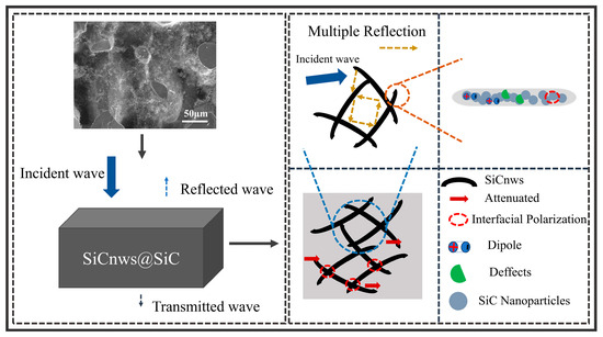 Figure 14 shows the electromagnetic wave absorption mechanism of SiCnws@SiC composites. When the electromagnetic wave is incident on the composite, part of it is reflected and transmitted, and most of it is absorbed into the material. First, the addition of SiCnws improves the impedance of the composite material, forming a structure with gradual impedance matching characteristics, so that electromagnetic waves can effectively enter the composite material, thereby increasing the contact area between electromagnetic waves and SiCnws [60]. The network structure formed by SiCnws and ceramic composite materials will cause multiple reflections and scattering of incident electromagnetic waves, so that the incident wave is attenuated [60,61]. Secondly, defects will be generated during the growth of SiCnws, and the defects will become the center of dipole polarization, thereby improving the polarization loss [26]. The network structure will also increase the transmission channel of carriers. Under the oscillating electromagnetic field [26], electron transfer and transition occur on the SiCnws, which improves the conductive loss of the composites. Finally, SiCnws and ceramic composite materials form a large number of heterogeneous interfaces, and a large number of electrons will accumulate at the interfaces with different conductivity on both sides. Under the oscillating electromagnetic field, interface polarization will be induced, thereby enhancing the dielectric loss [23]. The synergistic effect of these dissipation mechanisms improves the electromagnetic wave absorption properties of the composites.