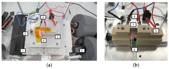 Measurement setup. (a) Measurement setup for the characterization of the electrocaloric sample. (b) Close-up view of the measurement setup. (1) Heat exchange plate, (2) thermocouple placed on the inflow of the recirculating chiller unit, (3) sample holder, (4) electrical contacts, (5) thermocouple for the surroundings, (6) thermocouple placed on the sample and (7) sample with affixed thermocouple on top.