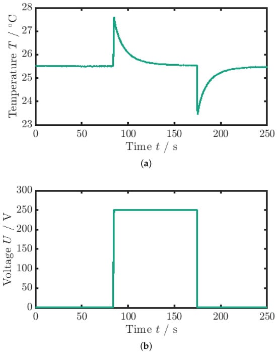 For the measurement of the adiabatic temperature change (), a quasi-instantaneous voltage signal is applied, as can be seen in Figure 3b. The quasi-instantaneous voltage jump () causes the material to heat up from the ambient temperature by the adiabatic temperature change (see Figure 3a).