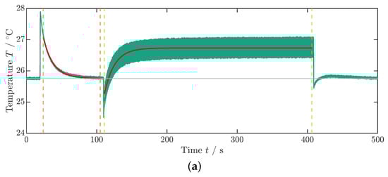Here, and denote the starting time and temperature, respectively. For the fit boundaries, the time frame between the two orange dashed lines at and in Figure 4a is used. Differing from Schipper et al. [28], in this paper, the first cooling phase is taken for fitting since the cycling period was ended with a field-off setting. Additionally, in order to mitigate an influence of inhomogeneous temperatures in the MLC on , the left boundary of the fit at is set with a time offset relative to the temperature peak to allow for a temperature equalization process of the active and inactive parts of the MLC (see Figure 1a). The curve fit is illustrated in Figure 4a by the red lines. Since, under the tested conditions, PST showed no visible Joule heating (see Figure 3a and Figure 4a), a Joule heating term was omitted in the fit function of the exponential temperature decay (see [35,36] for further details).