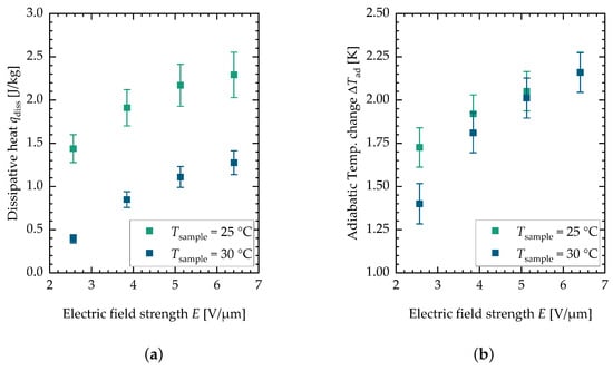 These values are plotted against the electric field strength for two different sample temperatures, namely and . The data points depicted are mean values of minimal twelve and maximal fifteen single measurements. The data from the two different batches can be found in Appendix A in Figure 4b for the adiabatic temperature change and in Figure 4a for the dissipative heat. It can be seen that the adiabatic temperature change increases for both sample temperatures with the electric field strength. For lower field strengths, the value is higher for lower sample temperatures. The dissipative heat measurements show a different behavior. For the lower sample temperature, the dissipative heat is bigger in general. This is consistent with measurements of the isothermal electrical polarization of PST performed by Nair et al. [37], where the hysteresis but also the maximum polarization decreased with an increase in temperature. The measurement data indicate that the phase transition is incomplete at the examined field strengths and sample temperatures. This can be observed in both the adiabatic temperature change and dissipative heat measurements. However, this study only explored a limited range of field strengths and sample temperatures in order to minimize damage to the samples (similar electric field strengths, for this reason, were also used in the active electrocaloric heatpipe system developed by Metzdorf et al. [17]). Both the dissipative heat and the adiabatic temperature change eventually reach a plateau at higher field strengths, indicating that the phase transition is completed (see the flattening of the curve above the measurements). The observed decrease in both the dissipative heat and adiabatic temperature change at higher sample temperatures is attributed to the fact that the phase transition requires higher electric field strengths. Consequently, this results in a shift in the curves along the x-axis toward these field strengths. Further investigation at additional sample temperatures would be beneficial to achieve a clearer representation of the data. However, PST has the characteristic of exhibiting a relatively narrow transition peak at low electric field strengths. The application of caloric materials for cooling purposes is typically centered around room temperature, which is the reason for selecting these specific sample temperatures. For multilayer components, it could be observed that they behave more like a relaxor exhibiting a broader temperature range of the caloric effect when the field strength is increased to ranges of to [37]. However, the peak of the caloric effect in consequence shifts more toward higher temperatures. Figure 6 shows the against the electric field strength for both sample temperatures.
