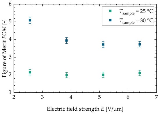Figure of merit for both sample temperatures versus the electric field strength. Both sample temperatures show a decrease in the figure of merit for higher electric field strengths. The maximum value can be found at a sample temperature of and is .