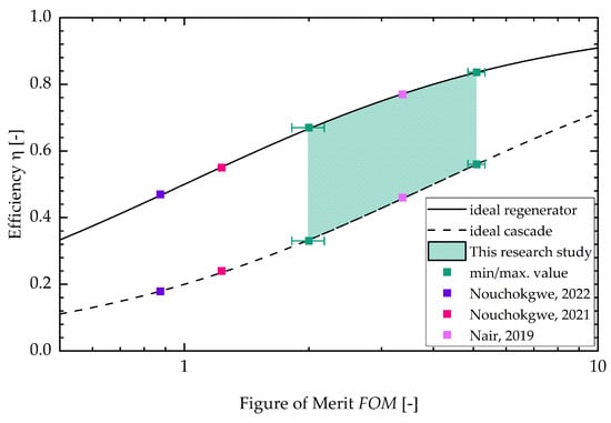 Efficiency versus . The literature values (Nouchokgwe et al. (violet data points) [32], Nouchokgwe et al. (pink data points) [33] and Nair et al. [37]) were calculated via thermal hysteresis and the adiabatic temperature change. The green interval depicts the result interval from the measurements, as demonstrated in this study, and the minimum and maximum value for the is depicted by data points.