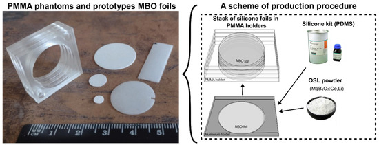The prototype 2D flat sheet MBO silicone foils of a size of 20.0 mm ± 0.1 mm in diameter and 0.43 ± 0.05 mm in thickness have been developed according to the procedure described previously [25]. The changes introduced into the currently used dosimeter contain new OSL material with another size of OSL grain powder (sieved below 125 µm) mixed into a transparent silicone PDMS matrix at a 1:3 weight ratio. It should be noted that silicone is just a host for OSL material, allowing optical access to the grains, providing mechanical protection, and ensuring foil flexibility. It does not add additional optical signals during 2D read-out measurements. The used MBO material was doped with Ce (0.3 mol%) and Li (10 mol%) and synthesized at the Paul Scherrer Institute in Switzerland [26]. This material exhibits a fast luminescence emission, a wide linear dose-response range, and close to tissue equivalency, as highlighted in other studies [27,29,30,31,32]. Figure 1 shows the scheme of the production procedure and examples of prototype foils. The synthesis of MgB4O7 co-doped with Ce and Li was carried out using the solid-state synthesis method. During the material production, the following analytical grade reagents were used (all reagents from Alphatec Chemical Corporation, Quezon City, Philippines); Mg(NO3)2 (99.99% purity), H3BO3 (99.99% purity), Ce(NO3)2 (99.5% purity), and LiNO3 (99.5% purity). The solution synthesis involves mixing metal salts with distilled water, heating the mixture to 300 °C with stirring until a gel forms, removing the stirrer, further heating to 500 °C until the gel becomes dry and golden, and then grinding the dried material into a fine powder using a mortar and pestle. The detailed structural and morphological characterization of the material has been presented in the following studies [33,34].