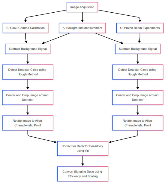 The 2D OSL images were acquired during the three-step procedure: 1st, during the background measurement, 2nd, during the 60Co gamma calibration campaign, and 3rd, during the experiments with the proton beam. Images are saved in the raw, lossless TIFF data format with a resolution of 1024 × 1024, single channel, and 16 bits per sample. Two images are acquired for each readout: live view (LV) with an image of the detector in visible light and raw signal (with OSL light emission from the detector). Further data analysis is performed using in-house developed calculation notebooks using the Python language (version: c15946). These are available in open repositories on GitHub (https://github.com/grzanka/osl_mb_foils, accessed on 17 April 2025). The workflow used in this work was adjusted to account for two factors as follows: