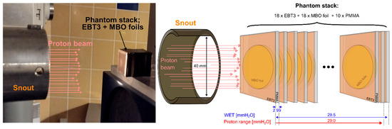 A specially designed phantom consisting of a stack of prototype MBO foils and EBT3 films was prepared (Figure 6). The phantom was constructed from PMMA square plates of 22 mm × 22 mm × 2 mm dimensions, with a hole tightly matched for MBO foils. In front of PMMA plates and MBO foils, the EBT3 films of the same size as the PMMA holder (22 mm × 22 mm × 0.3 mm) have been placed in selected positions. The phantom, consisting of 10 PMMA plates, 18 EBT3 films, and 18 MBO foils, folded tightly together and covered with black tape to protect against room light, was put on top of the therapeutic chair inside the treatment room during irradiations. The construction of the phantom is based on an experimentally determined water-equivalent thickness parameter (WET). The WET parameter relates to the thickness of the water layer, expressed in g/cm2, which causes the same loss of proton energy as in a given material with a given thickness. The WET parameters used in the phantom construction evaluated during separate experiments with proton beams are as follows: MBO foil (WET = 1.05), the PMMA plate (WET = 1.15), and the EBT3 film (WET = 1.31). The obtained values of the WET parameter and the number of used dosimeters (MBO and EBT3) resulted in an available range for proton propagation of such experimental phantom expressed in water millimeters to 29.5 mm, covering the 58.8 MeV protons’ range, which is approx. 29 mm in the water.