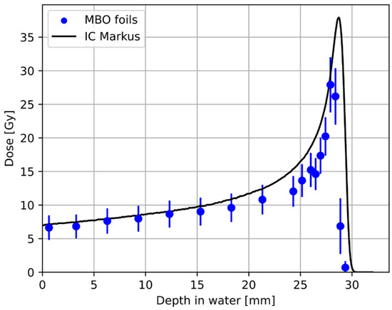 Comparison of the depth–dose response in water, measured for the Markus ionization chamber (solid black line) and the MBO foils placed in different depths in the unmodulated 58.8 MeV monoenergetic Bragg Peak. Data points denote mean values calculated on a circle with a radius of 90 px (~6.6 mm). The error bars on the MBO data points represent the spatial variability of pixel signals in the MBO foil. The dose was calculated by applying a 60Co calibration on a signal from proton irradiation. The distal part of the BP coincides with the last two experimental points from MBO foils.