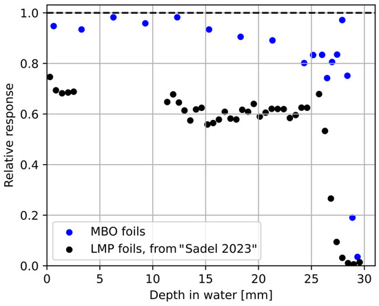 The MBO foils relative luminescence response (blue points) is calculated as the ratio of the dose obtained from the Markus ionization chamber (solid line in Figure 7) and the MBO foils (blue points in Figure 7). The last two blue points localized at the end of PB (for the 28 mm and 29 mm depth in water) represent the detectors where protons were partially stopped. The black points represent data for another previously tested LMP material according to [36]. For clarity, the error bars were not shown.