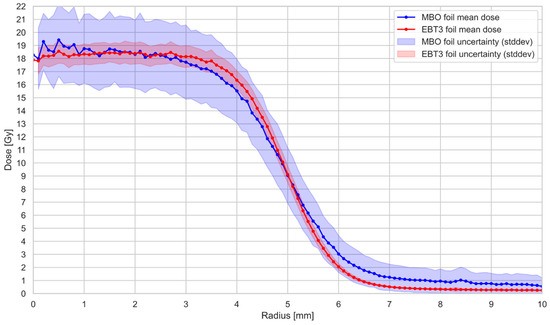 Comparison of the radial dose profile for EBT3 films (red line) and MBO foils (blue line) irradiated with 20 Gy of 58.8 MeV proton beam. Profiles were calculated by averaging pixel doses within concentric 0.1 mm rings centered on the gravity center of the dose distribution. Shaded bands represent measurement uncertainty (±1σ), calculated as the standard deviation of pixel values within each ring: red for EBT3 and blue for MBO. The center of the ring was taken as the gravity center of the dose distribution for each detector, respectively. Error bars presented here as the color bands were calculated as the standard deviation of doses from pixels within each concentric ring.