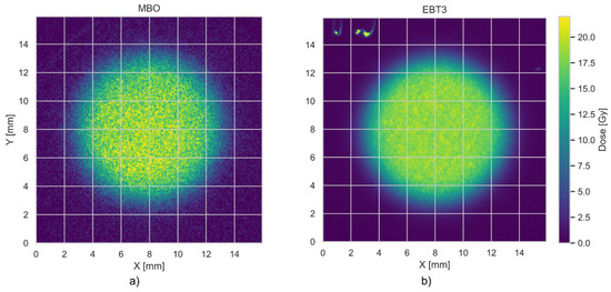 Figure 9 compares the radial dose profile for EBT3 and MBO foils, irradiated in one stack with a planned dose of 20 Gy of collimated (10 mm) 58.8 MeV proton beam. The irradiations were performed at a water-equivalent depth of 2.6 mm. Radial dose profiles were derived by averaging the signal intensity within concentric rings of 0.1 mm thickness, centered at the gravity center (centroid) of each detector’s dose distribution. This method assumes axial symmetry of the beam and uniform planar response of the detectors. The plotted profiles include shaded bands indicating the uncertainty of the dose values across each radius. These uncertainties are represented as ±1 standard deviation (1σ) of the pixel values within each concentric ring depicted in blue for MBO and red for EBT3. This reflects the degree of spatial variation in signal intensity within each radial segment rather than variability across repeated measurements. Figure 10 compares the 2D dose response obtained for the MBO foil (panel a) and EBT3 film (panel b). The MBO foil resolution calculated from the images acquired by the optical system setup (Figure 2) was 0.074 mm/px, corresponding well to the resolution of commercially used EBT3 films (0.085 mm/px, calculated for scanner resolution of 300 DPI). The obtained MBO spatial variability of the signal could be significantly reduced by applying median filters for each pixel, lowering the obtained error bars (see Figure 11). However, to keep the same image processing for both used MBO and EBT foils, we decided to perform all analyses without applying median filtering.