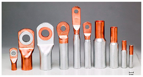 In the electrical industry, a copper-aluminum terminal clamp, or a cable connector, is produced in certain cylindrical shapes. Examples are given in Figure 1 [27]. For the needs of the electrical industry, Al/Cu connectors, Al/Cu bimetallic cable lugs, Al/Cu bimetallic sleeves and Al/Cu bimetallic terminations are used; additionally, for connecting aluminum cables with multiple wires of different cross-sections to electrical devices or connections. What concerns the advantages of using this friction welding joining method, as compared to conventional methods, is a matter of the necessity of using this joining method. First of all, two different materials are joined with different thermo-physical and mechanical characteristics, so the use of conventional joining methods in industrial production is practically impossible.