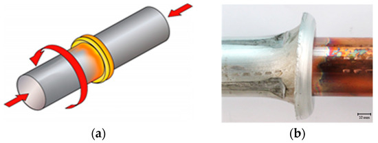 The procedure is carried out by rotating one part (held in the jaws of the welding machine) while the other part is firmly fixed on a slider. The part mounted on the slider cannot rotate but can move linearly to establish contact and generate friction pressure. When the end faces of the parts to be joined come into contact, the friction begins. As a result of the friction, a significant amount of heat is generated, which heats both parts and brings them to a plastic state [13]. The rotational movement is then abruptly stopped, ceasing further heat generation. An axial compressive force is then applied to the heated and softened parts, ensuring joining and welding, Figure 2a. Friction pressure induces maximum plastic deformation in both the axial and radial directions. In the axial direction, the parts are shortened, while in the radial direction, the material is extruded along the perimeter, forming a material ridge or the so-called “mushroom” shape, Figure 2b.