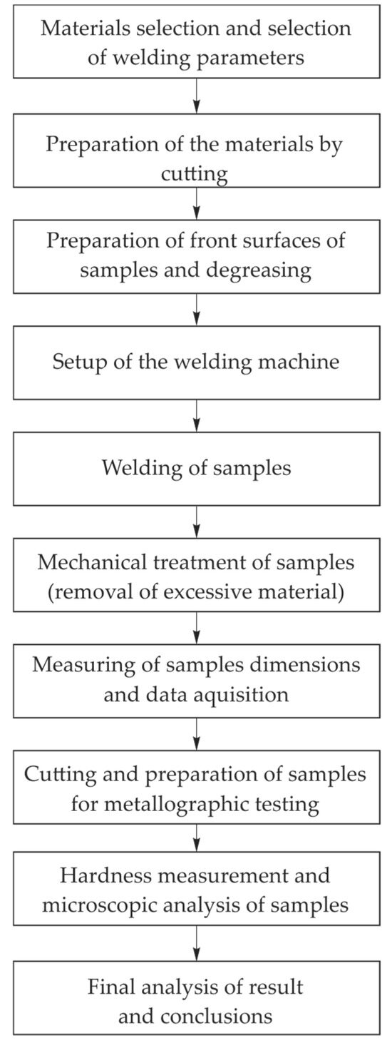 The experimental plan included the preparation of samples to the appropriate dimensions, their welding, measurement of newly formed dimensions, preparation of samples for metallographic testing and hardness testing. The flow chart of the process is shown in Figure 3.