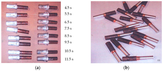 The friction time (t) is the time required for the contact surfaces to heat up to reach the maximum temperature necessary for the welding process to begin. As an important parameter in the friction welding process, the friction time depends on other factors such as the properties of the base materials (strength, thermal conductivity, ductility, etc.), friction speed, friction pressure, shape and dimensions of the welded parts, etc. [14]. When different metals are being welded, the friction time, along with other welding parameters, is often chosen based on the material of a lower strength. The friction time is measured from the beginning of the second phase until the moment when the pneumatic brake instantly stops the rotation of the aluminum part. The finished welded joints are shown in Figure 5a.