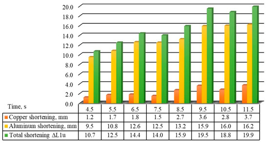 Thermomechanical effects in the weld zone led to intense and rapid plastic deformation, resulting in an axial shortening of the welded elements. The magnitude of axial shortening depends on several factors related to the welded material and its geometric characteristics, as well as the welding process parameters (pressure, welding speed, welding time, etc.) [17]. The value and rate of axial deformation increase with increasing friction time and pressure, and for each material, their optimal values were experimentally determined. In comparison to the optimal values, small values of axial shortening lead to incomplete and poor-quality joints, as there may be the occurrence of the so-called circular unwelded areas. Larger values of axial shortening result in increased material consumption during the welding. Based on the expected axial deformation (shortening), the final lengths of the welded parts were determined. The shortening as a function of the friction time is presented in the histogram in Figure 6.