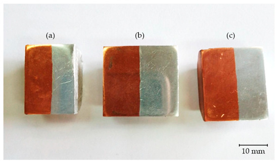 Al-Cu joint samples for microstructural investigations. Friction times 6.5 s (a), 7.5 s (b), 9.5 s (c).