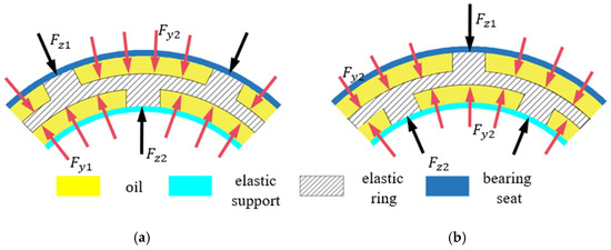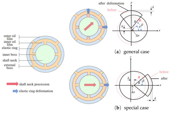The direction of journal movement is different, so the deformation of the elastic ring is different at different moments. This paper, according to the number of stressed cams, will be divided into two cases, as shown in Figure 3.