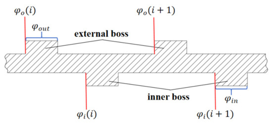 Based on these two different deformation cases, the deformation of the elastomer ring at the position corresponding to the angle can be obtained, and since the thickness of the elastomer ring is very thin, it can be assumed that the deformation of the elastomerized inner and outer rings at the same position is equal. Assuming that there are n outer tabs and there are n inner tabs, each of which has width D, the corresponding angles of the outer tabs are , the corresponding angles of the inner tabs are , the starting angle of each inner tab is set to be (i = 1, 2, 3, …, n), and the starting angle of the inner tabs is set to be (i = 1, 2, 3, …, n), as shown in Figure 4.