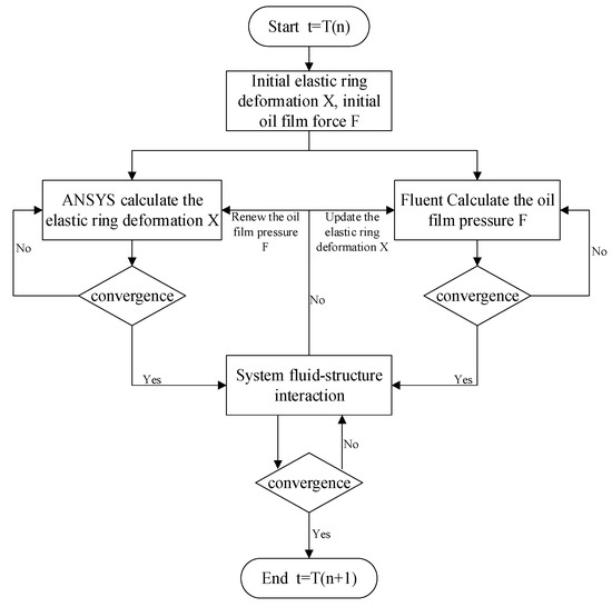 Assuming that at the moment T(n), the elastic ring and the inner and outer oil films have an initial deformation X and oil film pressure F, which is 0 at the initial moment, then it is mainly the external excitation or the X and F converged at the previous moment. At this time, the initial inner and outer oil films’ motion and the elastic ring force and deformation are substituted into the corresponding solvers and iterated, respectively. When both the solid structure solver and the fluid structure solver converge, the internal and external oil film pressure F calculated by the fluid structure and the elastic ring deformation X calculated by the solid structure are substituted into the two-way fluid–solid coupling solver, and the mesh interpolation and mutual exchange are used to determine whether the coupling converges or not. If the coupling does not converge, the internal and external oil film force F obtained from the fluid structure calculation is used as the initial condition for the solid structure calculation, and the elastic ring deformation X obtained from the solid structure calculation is used as the initial condition for the fluid structure calculation to carry out iterative calculations again until the fluid–solid coupling system converges, and when the fluid–solid coupling system converges, the oil film force and the elastic ring deformation of the moment are outputted as the results of the calculations and as the initial condition for the next moment, and the oil film force and the elastic ring deformation of the next moment are outputted as the results of the calculations. When the fluid–solid coupling system converges, the oil film force and the elastic ring deformation at this moment are outputted as the calculation result and as the initial condition for the next moment, and the next moment is calculated.