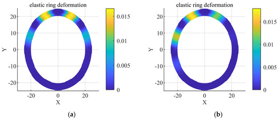 Through the calculation as well as the ANSYS simulation, it is understood that the deformation of the whole axial elastic ring is consistent, so the deformation of the elastic ring can be analyzed by obtaining any one of the middle cross-sections, and the deformation data of the symmetric plane are obtained here for discussion. According to the data in Figure 7a,b, the deformations on the inner walls of the elastic rings in the two states at the maximum deformation position are 0.0156 mm and 0.0169 m, while the deformations on the outer walls are 0.0162 mm and 0.0174 mm, respectively, which are less than 3%, indicating that the deformations of the inner and outer walls at the same circumferential position are nearly the same. This is due to the fact that when the elastic ring is subjected to force, the direction of force is always perpendicular to the inner and outer surfaces of the elastic ring, so when the deformation is not very large, the elastic ring will not be deformed in other directions. This result is also consistent with the assumption of the elastic ring as a thin-walled structure in our previous theoretical analysis and verifies the correctness of the previous theoretical analysis.