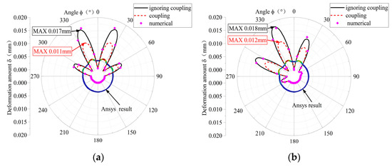 The circumferential deformation of the elastic ring, obtained by considering the fluid–structure coupling and not considering the fluid–structure coupling, and the numerical calculation for the two cases are shown in Figure 8, respectively. The results of the numerical calculations in the figure are basically consistent with the simulation results, which verifies the correctness and reliability of the model. From Figure 8a,b, it can be seen that the deformations of the elastic rings without considering the fluid–solid coupling are 0.017 mm and 0.018 mm, while the deformations of the elastic rings with the consideration of the fluid–solid coupling are 0.011 mm and 0.012 mm, respectively, which are about 35% lower than that of the deformations without considering the fluid–solid coupling on the average, because after considering the fluid–solid coupling, the inner and outer oil films will form a dynamic pressure with the inward movement of the elastic ring. The reason is that after considering the fluid–solid coupling, with the movement of the elastic ring, the inner and outer oil films will form a dynamic pressure oil film, which generates a certain amount of oil film pressure on the corresponding shaft segments to reduce the deformation of the elastic ring, and the more obvious the deformation of the elastic ring, the greater the oil film pressure.