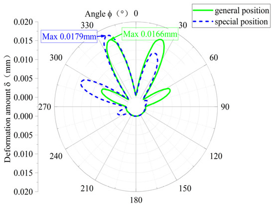 In order to study the effect of the action of internal and external oil film fluid–solid coupling on the deformation of the elastic ring, a load with variable direction is applied to the journal. The results are compared with the action without considering the internal and external oil film fluid–solid coupling, and the deformation of the elastic ring is analyzed by taking two states, respectively, in which Figure 7a is the double-bump force case, and Figure 7b is the single-bump force case.