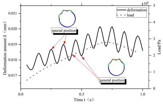 In order to further investigate the deformation of the elastic ring at different positions, Figure 10 shows the maximum deformation of the elastic ring at different moments when the load is varied at a certain frequency. When the load changes, the maximum deformation of the elastic ring is not linearly followed by the increase but appears similar to the trigonometric function of the periodicity, and the period is about 0.125 s. The maximum deformation is always larger and then smaller to show a periodic shape. Because the load applied here not only changes in size with time but also changes in direction with time, when the load direction changes, the elastic ring is always converted between the single-bump force state and the double-bump force state, which leads to a change in the maximum deformation of the elastic ring. The corresponding moments of each extreme value are the moments of the single-bump force state of the elastic ring, and the other moments are the double-bump force state.