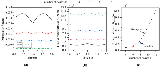 Effect of changes in the number of bosses on the deformation and stiffness of the elastic ring. (a) Deformation of the elastic ring. (b) Time-varying stiffness of the elastic ring. (c) Mean stiffness change.
