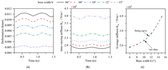 Effect of changes in the boss width on the deformation and stiffness of the elastic ring. (a) Deformation of the elastic ring. (b) Time-varying stiffness of the elastic ring. (c) Mean stiffness change.