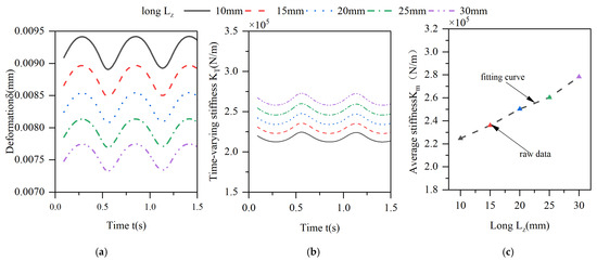 The effect of the axial length of the elastic ring on the deformation of the elastic ring is shown in Figure 14. With the increase in the axial length, the deformation of the elastic ring also shows a decreasing trend, but the change is not very obvious. When the thickness is increased from 10 mm to 30 mm, the amount of change in the elastic ring decreases by only about 20%. The effect of the same increase in tab width on the time-varying stiffness characteristics of the elastic ring is only reflected in the fact that the overall stiffness shows an increasing trend. This is due to the fact that the increase in the width of the elastomerization does not change the span of the deformed beam of the elastic ring, nor does it change the thickness of the oil film; it only increases the area under force and thus increases the stiffness. Moreover, as the area under force increases, the reaction force provided by the oil film pressure increases, which also further enhances the stiffness of the elasticized ring.
