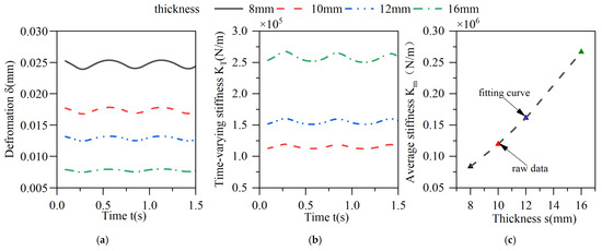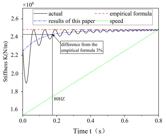 In Equation (36), n is the number of nodes, and and are the load and displacement of the corresponding nodes, respectively. According to Equation (35), combined with the deformation of the elastic ring and the applied load, the time-varying stiffness curves of the elastic ring can be obtained by considering the oil film fluid–structure coupling, as shown in Figure 11.