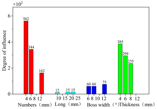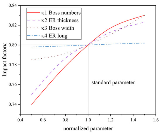 indicates that the independent influence factor of each parameter, according to Figure 12, Figure 13, Figure 14, Figure 15 and Figure 16, can be obtained from the influence factor of the number of tabs, width, length, and the thickness of the elastic ring , , as shown in Figure 17. The number of tabs being 8, the width being 10°, the thickness being 10 mm, and the length being 15 mm are used as the parameter normalization criteria, and their corresponding influence factor is 0.8.